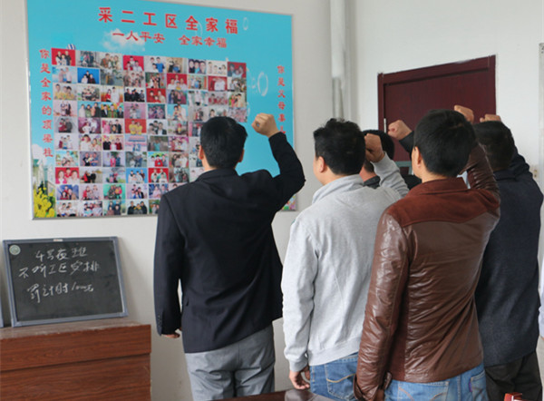 生产工区把每位职工的“全家福”照片挂在会议室安全宣传栏内,入井前让职工面对父母妻儿祈盼的眼神,灿烂的笑容进行宣誓,下定遵章守纪、用心工作、安全生产的决心,提醒职工心想亲人,关注安全,珍惜生命,善待自己。进入现场,集中思想,高高兴兴上班去,平平安安回家来。让职工深刻认识到自己不仅仅属于自己,更属于亲人和家庭。知道自己肩负的家庭重担和社会责任。