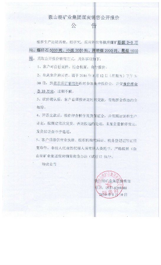 伟德源自英国始于1946集团煤炭销售公开报价公告20160810