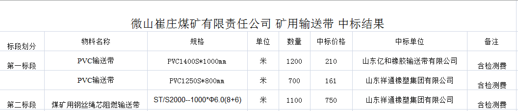 微山崔庄煤矿有限责任公司 矿用输送带 中标结果