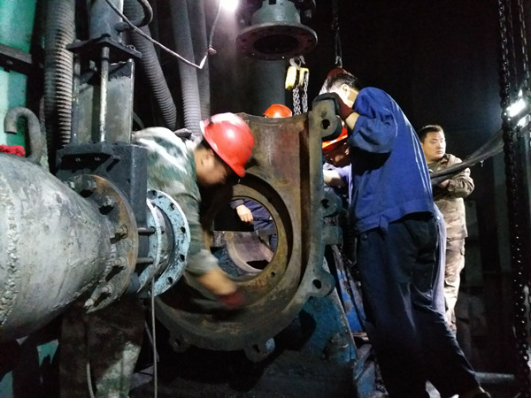 检修的第一步就是先将浮选柱煤泥水放空,同时拆卸入料短管。工作现场,有的拆卸出料短管螺丝,有的拆卸前护壳螺栓,还有的拆联轴器罩子等,每一道拆卸工作有序展开。拆卸完成后用2吨倒链吊在前泵壳上,维修人员积极配合利用撬棍将前泵壳和前护板拆卸,利用专用吊装蜗壳的勾头挂在蜗壳上,锁紧螺栓,再利用撬棍将蜗壳拆下。有经验丰富的维修人员负责拆卸叶轮,当拆卸完叶轮后,大家终于松了一口气。随之迅速对前后护板的厚度、叶轮的直径、轴套、填料箱内部磨损情况,就像医生把脉般进行认真仔细检查,再根据《选煤厂设备完好标准》进行对比,对于一些超出磨损标准的备件进行更换,对于没有超标的做好记录,等下个周期再检查更换,整个过程做到了精益求精,一丝不苟。
