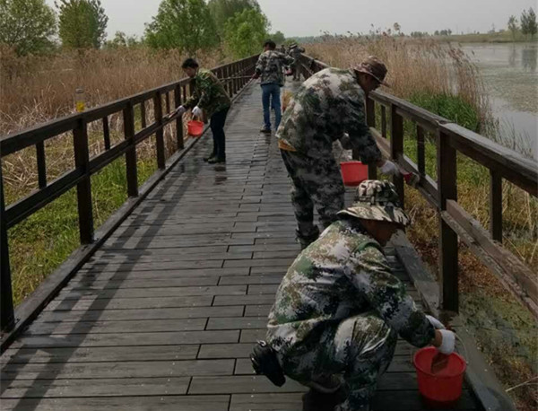湿地景区的木栈道经多年风吹日晒,出现了皲裂、翘起等问题。近日,湿地公司在做好运营工作的同时,组织员工进行了维修维护、粉刷桐油等工作。